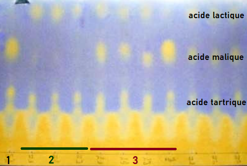 Un contrôle régulier des vins est fait pour savoir à quel stade est la FML. Ce suivi peut se faire au domaine par une méthode d’analyse simple, la chromatographie. Sur l’image, on voit 11 différentes colonnes correspondant à 11 vins différents. Sur la partie bleue, des taches jaunes correspondent aux différents acides du vin. En effet, lorsque le papier est trempé dans le solvant (butanol et acide acétique), il opère une élution différentielle des composants du vin, qui migrent plus ou moins vite sur le papier. Le colorant (bleu de bromophénol) contenu dans le solvant permet de révéler les acides. On voit donc la présence et l’absence d’acide malique et lactique. En l’absence d’acide lactique, ou en faible quantité, la FML n’a pas débuté (cas 1). En l’absence d’acide lactique, la FML est finie (cas 2). En présence de ces deux acides, la FML est en cours (cas 3).
