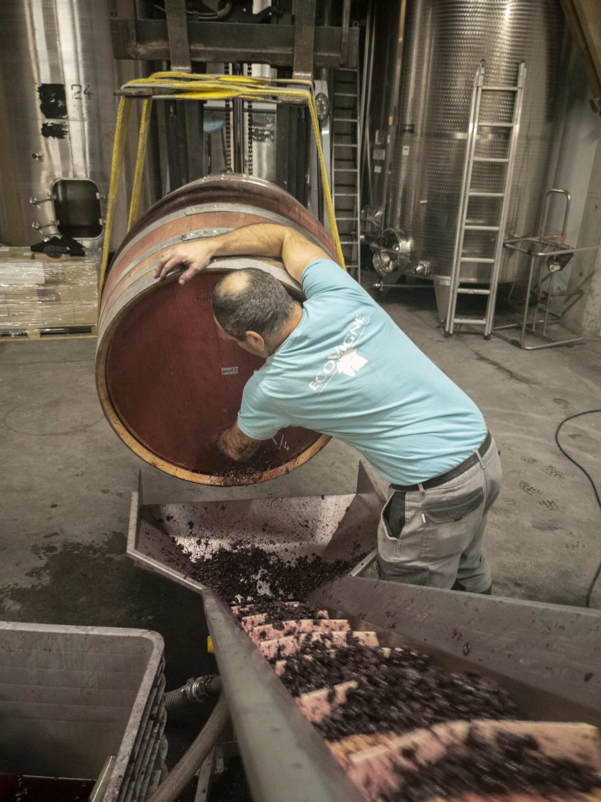 Après ces deux mois, le jus est tiré et le raisin fermenté (le marc) est pressé. Ce procédé est fastidieux. Il faut renverser les tonneaux pleins sur le côté (ils étaient debout à l’entonnage), étape délicate voire dangereuse à cause de leur poids. Sortir le marc est aussi compliqué et inconfortable : une bonne partie est tirée à la main mais le tout est tassé et le fond est difficilement atteignable avec le bras.